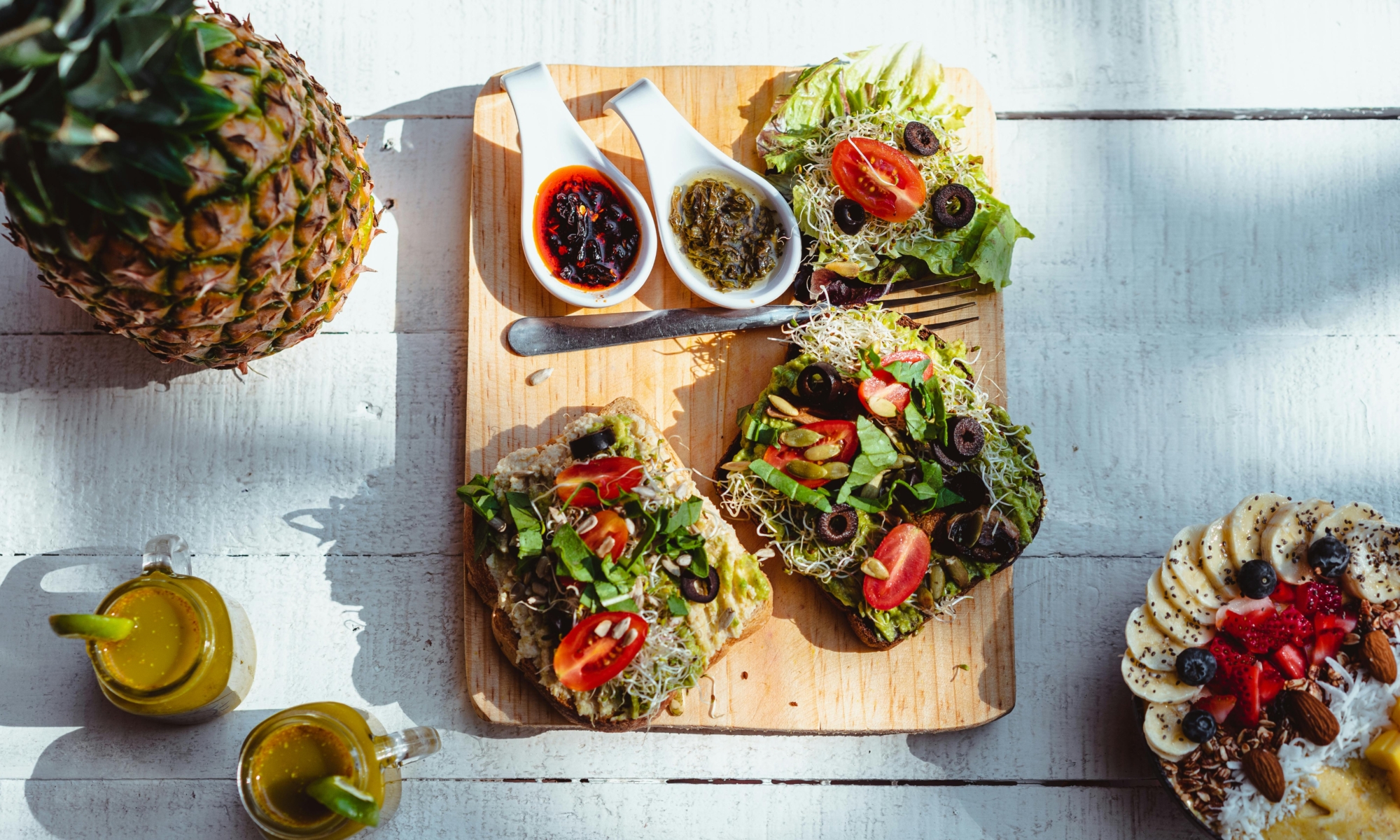 - Avocado-Ei-Sandwich: Vollkornbrot mit Avocadocreme bestreichen, mit hartgekochten Eierscheiben, Tomate und Sprossen belegen.